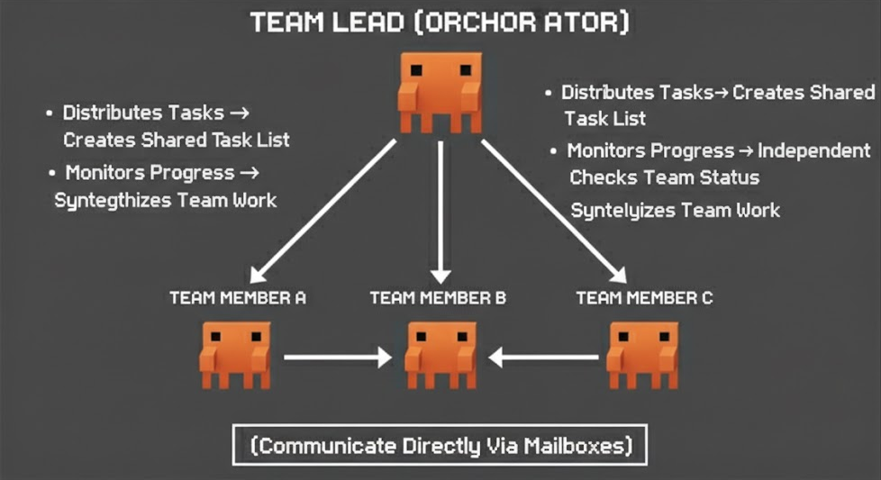 팀 리드가 공유 태스크 목록을 만들고 팀원을 생성하면, 각 팀원은 독립적인 컨텍스트 윈도우에서 자기 작업을 수행합니다.