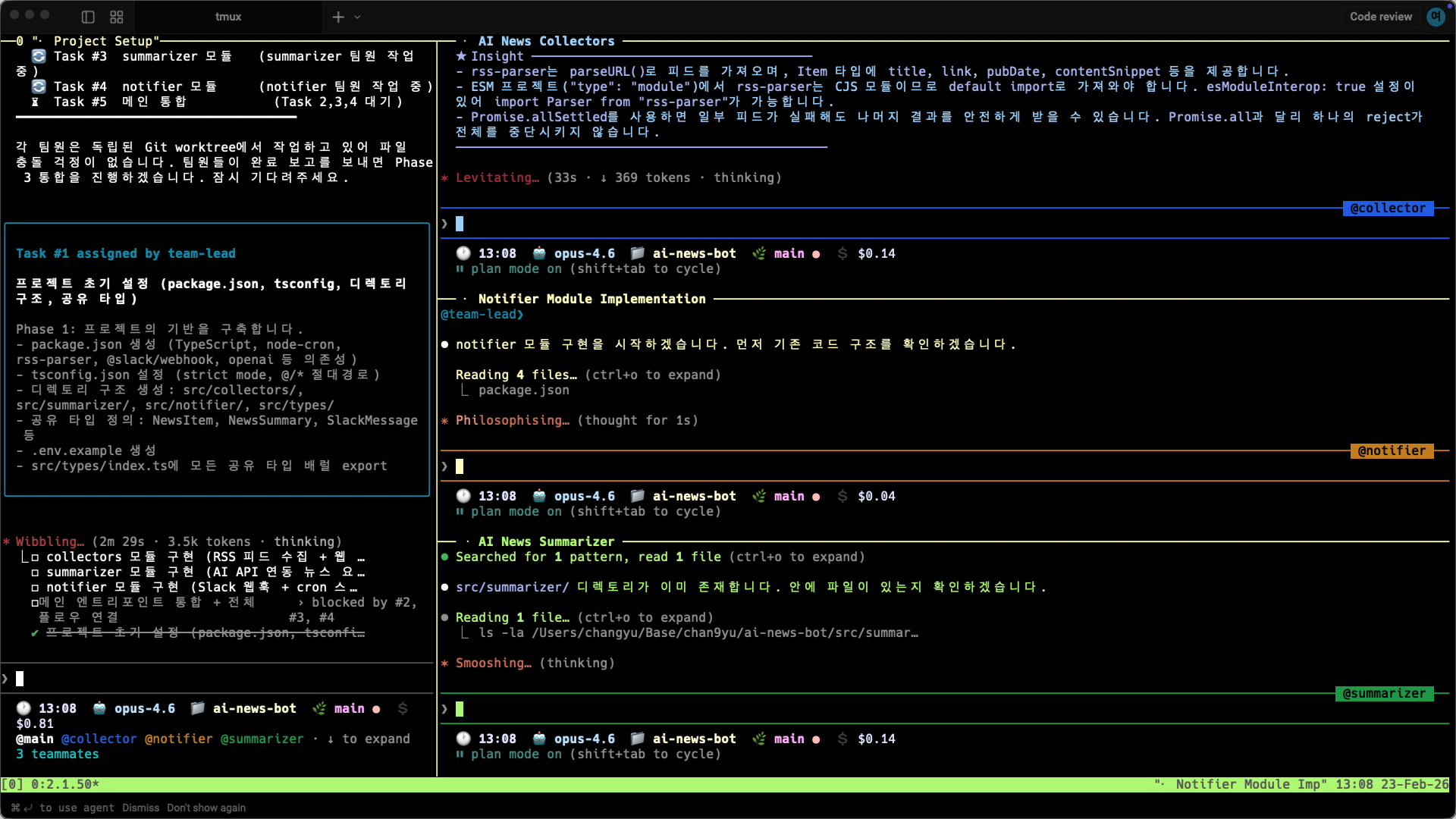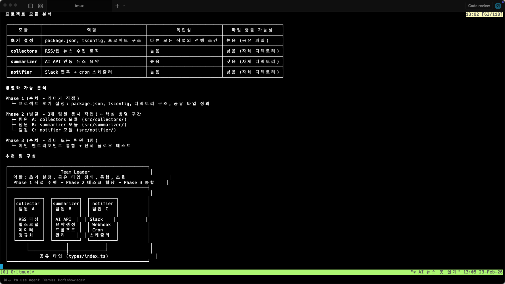 뉴스 수집, AI 요약, 슬랙 알림 — 세 모듈이 독립적이라 병렬 개발에 딱 맞는 구조였거든요.