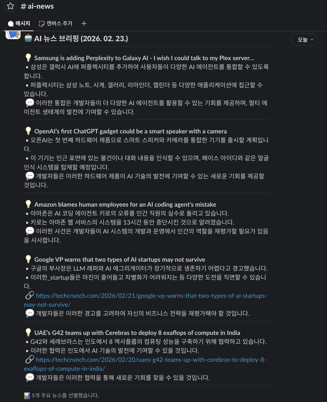 AI 뉴스를 매일 수집해서 슬랙으로 요약 알림을 보내는 Node.js 봇을 만들 거야.