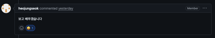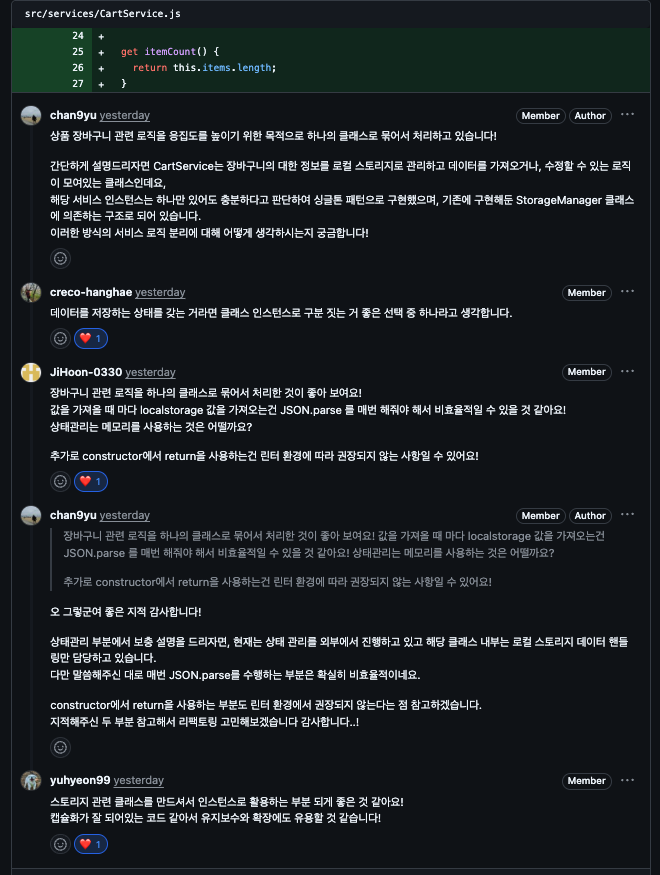 이렇게 다수에게 코드 리뷰를 받아본 적이 처음인데 정말 좋은 것 같습니다. 여러 의견들을 듣고 보니 개선점과 문제점도 보이고 리팩토링 방향성도 보이는 도움이 많이 되는 것 같았어요.