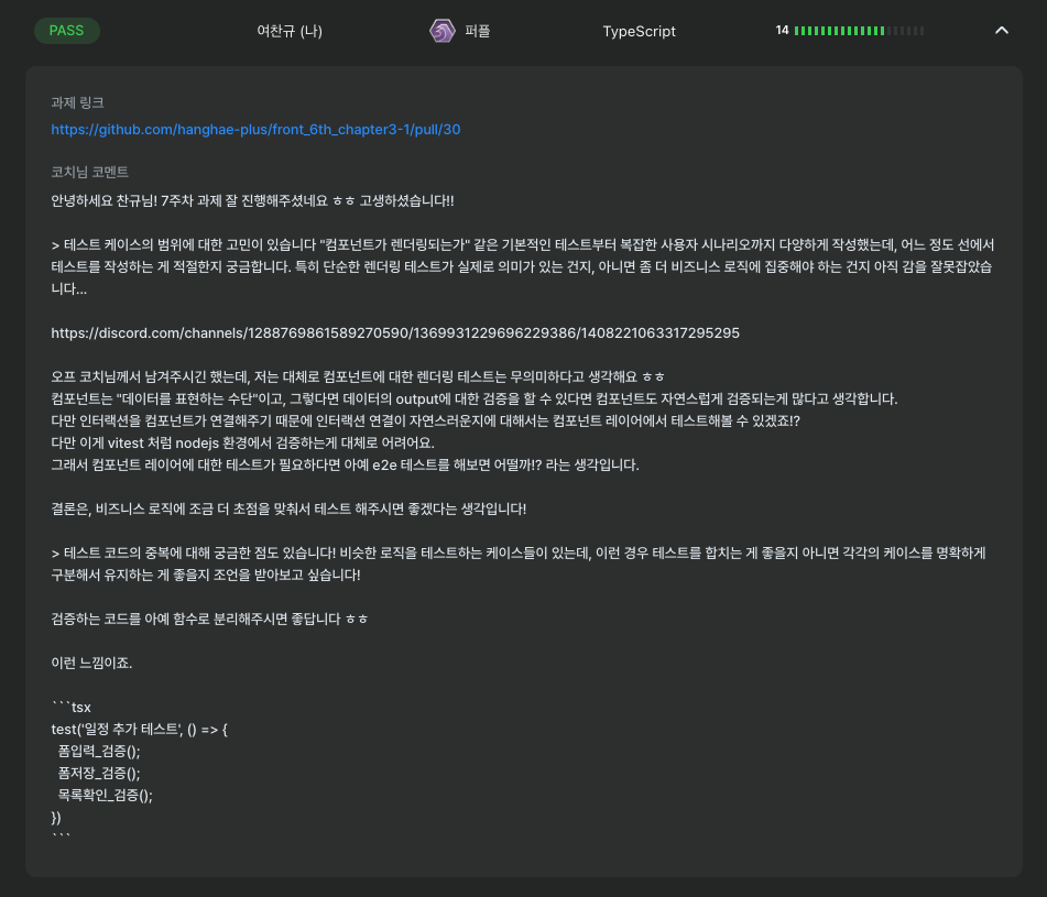 이번에는 기존 코드에 테스트를 추가하는 방식이었는데, 다음에는 테스트를 먼저 작성하고 기능을 구현하는 TDD 방식을 시도해보고 싶습니다. (마침 다음 주차 과제가 TDD라서 해볼 수 있을 것 같네요!)